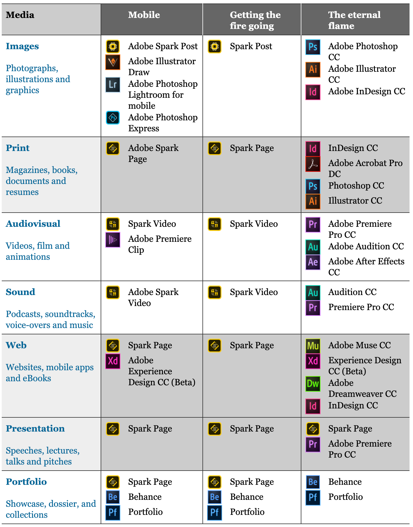 In Chapter One you saw the matrix below, which is a menu for the most widely used Creative Cloud applications. This first column is the heart of Chapter One because when you’re getting started, it’s best to focus more on the intellectual work you want to accomplish rather than the individual applications themselves. The purpose of Adobe Creative Cloud Across the Curriculum is to encourage critical digital literacy, which means that you learn more about how meaning and media work as opposed to functional digital literacy, which is more about which buttons to push. Critical digital literacy explores why you want to push the buttons in the first place, whereas functional digital literacy is only about how to operate the software. Critical digital literacy is a capacity that you continually develop as a lifelong learner. Functional digital literacy is skill you learn once that doesn't evolve much.