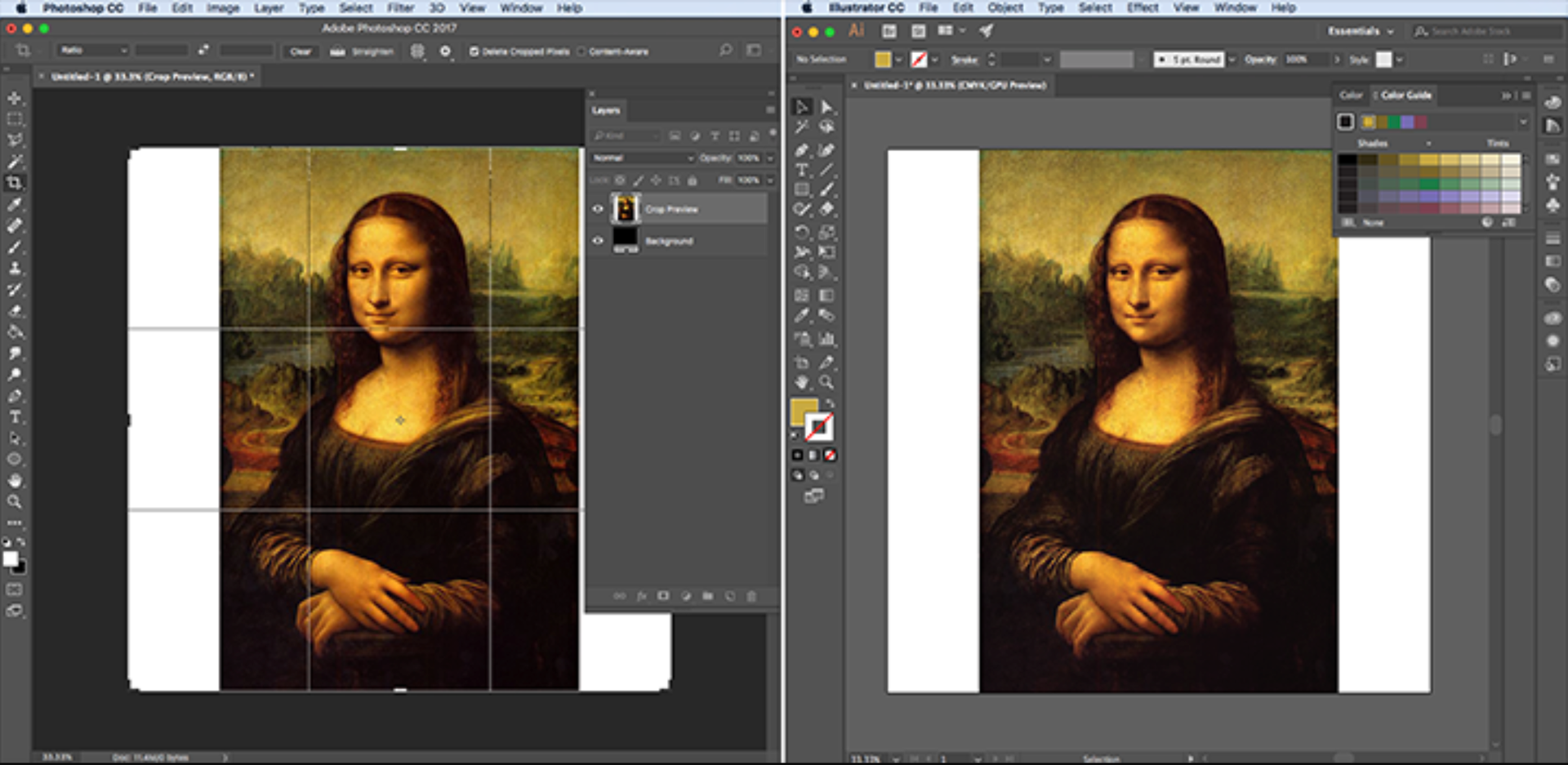For example, you might have heard of the “rule of thirds,” which suggests that it’s often more effective for you to place the subject of your image in one third of the frame, rather than the dead center. In the left interface from Photoshop, I’ve activated the Crop tool, which has automatically divided the frame horizontally and vertically into thirds. With the help of the Crop tool guidelines, you can see that Mona Lisa’s chin rests almost exactly on the top third of da Vinci’s composition. In the screenshot from Illustrator, I used the Eyedropper tool to select the paint color in the sky over Mona Lisa’s shoulder. I then activated the Color Guide properties panel, which analyzes da Vinci’s use of color and displays a bunch of color swatches that belong in the palette.
